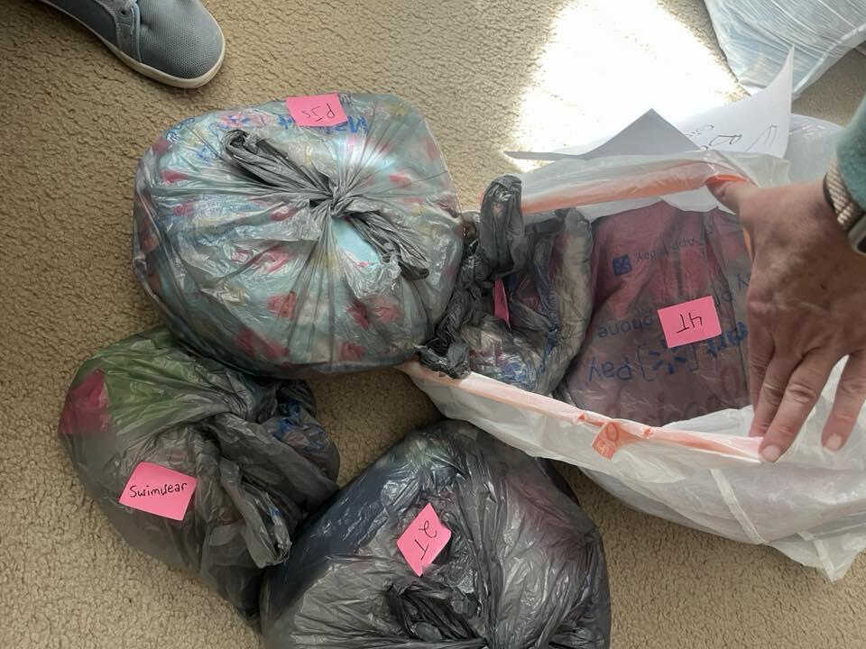 Please sort clothing into bags (grocery or trash) or boxes by size and label the size and your first and last name on the outside (See Image).