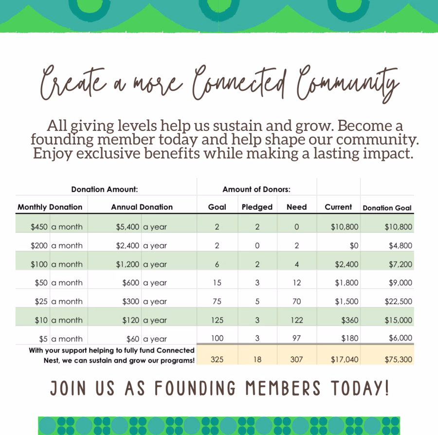 Their financial sponsorship has helped sustain Connected Nest as we provide dynamic community support.